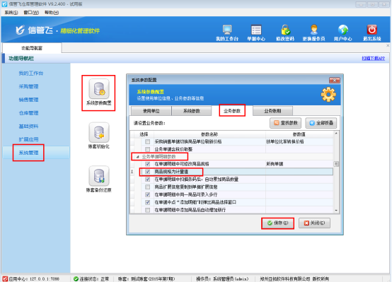 在功能導航窗點擊“系統(tǒng)管理”——》“系統(tǒng)參數(shù)配置”——》“業(yè)務參數(shù)”可以進入到“業(yè)務參數(shù)”配置界面,在業(yè)務單據(jù)明細參數(shù)中,勾選“商品規(guī)格為計量值”參數(shù),然后保存設置,如下圖所示:
