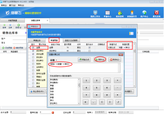 設置完成之后,在功能導航窗點擊“銷售管理”——》“銷售出庫單”,打開銷售單,打開界面設計選擇“單據(jù)明細”的金額,取值方式選擇“計算公式”—》取值設置設置為“{規(guī)格} *{數(shù)量} *{單價}”保存計算公式,最后保存界面設計。操作步驟如下圖: