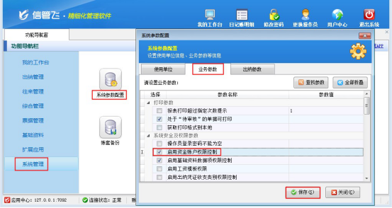 在功能導航窗選擇“系統管理”—》“系統參數配置”—》“業務參數”進入業務參數配置界面,在系統安全及權限設置中勾選“啟用資金賬戶權限控制”參數,如下圖所示: