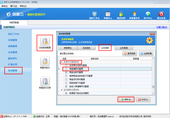 以信管飛倉庫管理軟件為例,在系統管理—》系統參數配置—》業務參數內將“數據可否重復參數”中的“商品編碼可重復”參數的勾選取消,然后保存設置。如下圖所示: