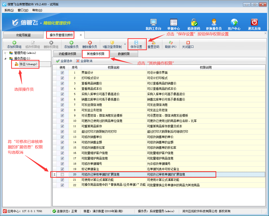 在功能導航窗點“系統管理”—》“操作員及授權”即可進入“操作員管理及授權”界面,選中操作員賬號,在“其他操作權限”界面將“可修改已審核單據的擴展信息”權限勾選取消,如下圖所示,設置操作員賬號“張亞”不可直接修改已審核單據的擴展信息,設置完成后點擊“保存設置”按鈕保存權限設置。