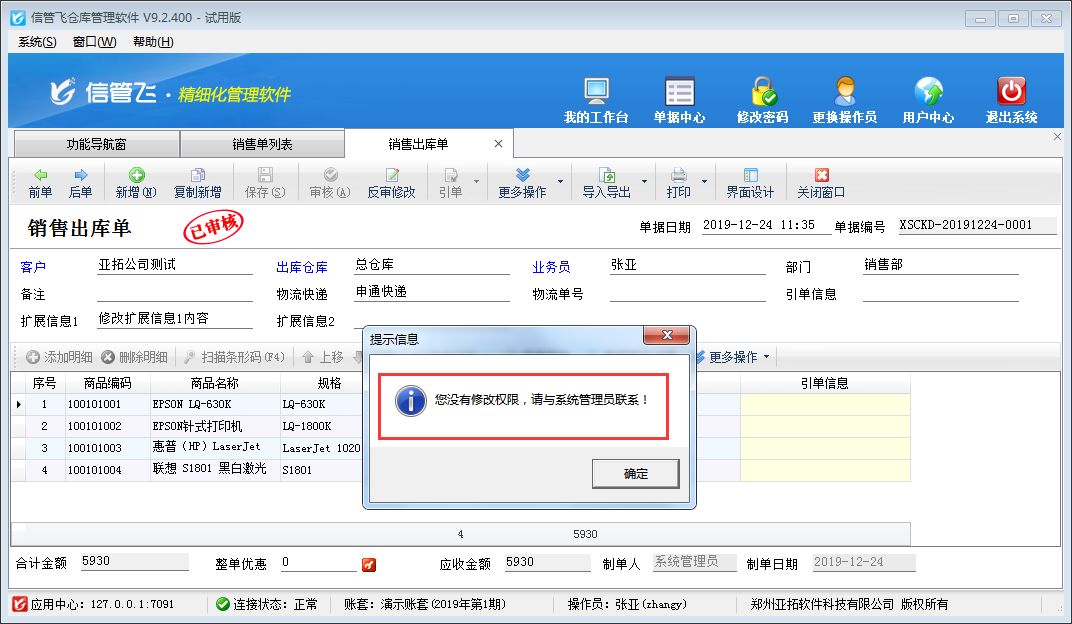 權限設置完成之后,我們使用操作員賬號“張亞”登陸軟件,打開一個已審核的銷售出庫單單據,點擊單據主體.擴展信息1后的“...”按鈕修改擴展信息1內容時系統會彈出提示信息:您沒有修改權限,請于系統管理員聯系!如下圖所示。