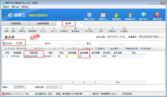 假如實際盤點商品“EPSON LQ-630K”庫存數(shù)量為20臺,和軟件中查詢到的庫存數(shù)量不一致,需要在軟件中開一個盤點單進(jìn)行更正庫存數(shù)量,在“倉庫管理”中打開“盤點單”,選擇倉庫“主倉庫”,然后選擇商品“EPSON LQ-630K”,輸入盤點數(shù)量“20”,然后保存審核盤點單,然后再次查詢庫存,可看到庫存數(shù)量已更正為20。如下圖所示:
