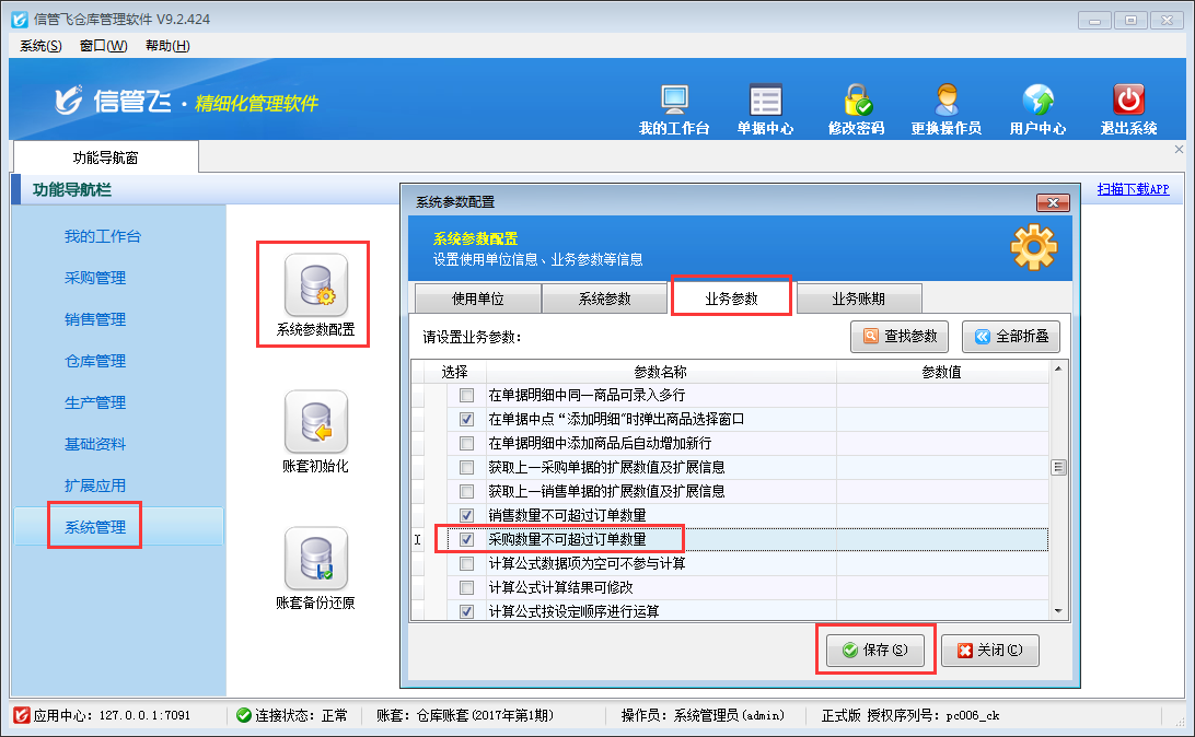 在功能導(dǎo)航窗點(diǎn)擊“系統(tǒng)管理”—》“系統(tǒng)參數(shù)配置”—》“業(yè)務(wù)參數(shù)”,即可進(jìn)入到“業(yè)務(wù)參數(shù)”界面,在業(yè)務(wù)單據(jù)明細(xì)參數(shù)中勾選“采購數(shù)量不可超過訂單數(shù)量”參數(shù),然后點(diǎn)擊“保存”按鈕保存配置,如下圖所示。