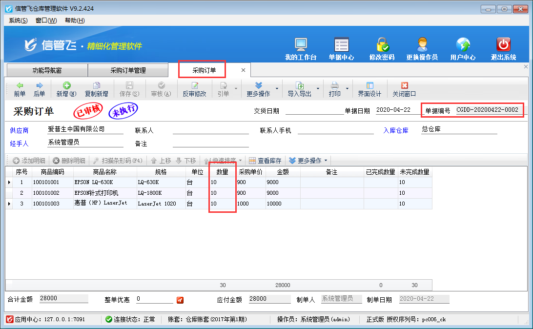 設(shè)置完之后,在功能導(dǎo)航窗點(diǎn)擊“采購管理”—》“采購訂單”,新增采購訂單,添加三條商品明細(xì),數(shù)量分別為10,然后保存并審核采購訂單,如下圖所示。