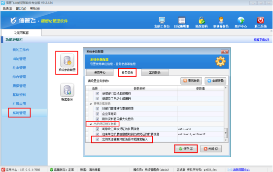 在功能導航窗點擊“系統管理”——》“系統參數配置”——》“業務參數”可以進入到“業務參數”配置界面,在出納憑證相關參數內打勾啟用“出納憑證摘要只能選擇不能隨意輸入”參數,然后保存,如下圖所示: