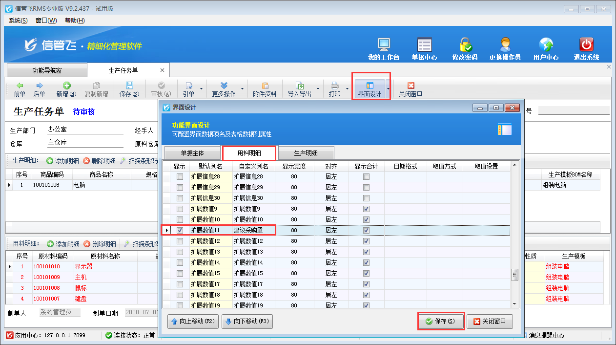 參數(shù)配置完成之后,打開生產(chǎn)任務(wù)單,在“界面設(shè)計(jì)”—》“用料明細(xì)”中將“擴(kuò)展數(shù)值11”自定義列名為“建議采購量”,并勾選顯示出來,如下圖所示。