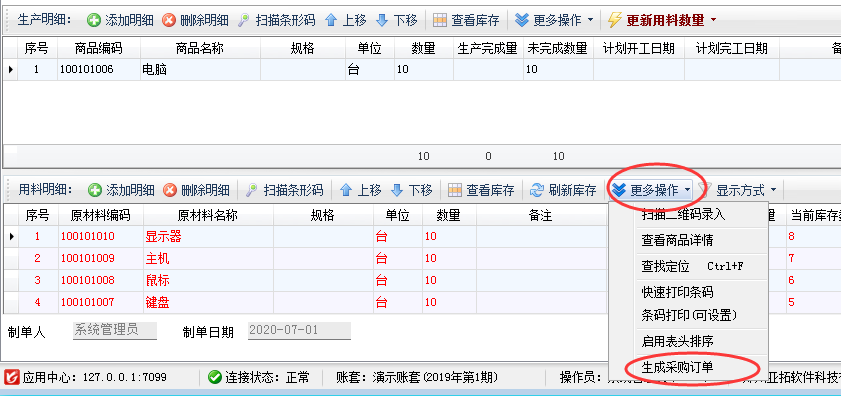 點(diǎn)擊“用料明細(xì)”工具欄“更多操作”—》“生成采購訂單”即可將原材料建議采購量直接生成采購訂單便于采購人員進(jìn)行采購,如下圖所示。