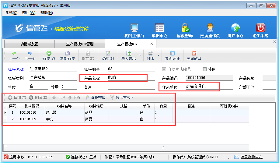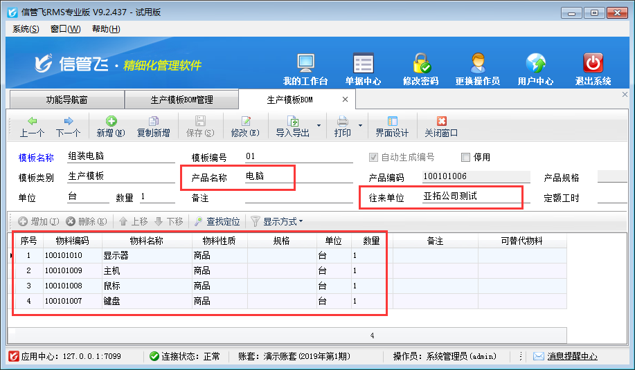 參數配置完成之后,打開生產管理模塊,重新新增生產模板BOM表時,即可選擇往來單位,如下圖所示,在給“亞拓公司測試”、“藍貓文具店”兩家客戶生產同樣的產品“電腦”時設置的不同的生產模板,所需的原材料不同。
