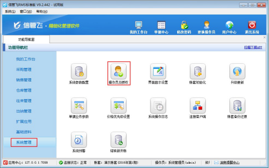 信管飛RMS軟件信管飛倉庫管理軟件信管飛出納記賬軟件信管飛送貨單軟件等都支持設置多個操作員登錄軟件,本文以信管飛RMS軟件標準版為例演示一下如何新增操作員賬號并設置操作員權限?