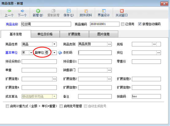啟用商品副單位后,在商品信息中可以維護副單位。在功能導航窗點擊“基礎資料”—》“商品信息”,新增商品窗口選擇商品副單位,如圖2所示。