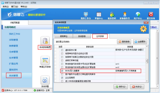 在功能導(dǎo)航窗點(diǎn)擊“系統(tǒng)管理”—》“系統(tǒng)參數(shù)配置”,選擇“業(yè)務(wù)參數(shù)”,勾選參數(shù)“Excel導(dǎo)入銷售單(按單據(jù)編號導(dǎo)入不同單據(jù))”,保存設(shè)置,如下圖所示:
