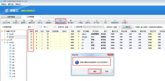 在功能導航窗點擊“綜合管理”—》“工資單管理”,打開工資單管理界面,在工資記錄列表中打鉤選擇要審核的工資記錄(工具欄點擊“批量操作”支持全選),然后點擊“審核工資記錄”,系統彈出提示信息“您確定要審核當前選擇的工資記錄嗎”,如下圖所示,點擊“確定”按鈕確定批量審核工資記錄。