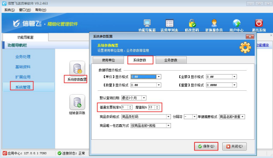 在功能導航窗點擊“系統管理”—》“系統參數配置”—》“系統參數”,在“系統參數”界面可以設置“普通發票稅率”及“增值稅發票稅率”(這里分別設置為3%及13%),設置完之后點擊“保存”按鈕保存配置,如下圖所示: