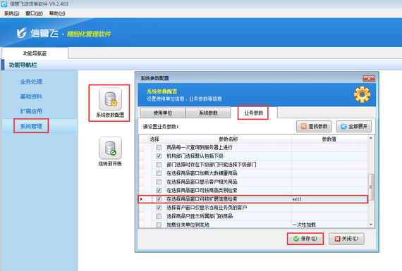 在功能導航窗點擊“系統管理”—》“系統參數設置”—》“業務參數”可以進入到“業務參數”配置界面,在數據選擇參數內打勾啟用“在選擇商品窗口可按擴展信息檢索”參數,并設置參數值(擴展信息字段名),默認為“ext1(擴展信息1)”,如下圖所示。