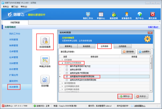 在功能導(dǎo)航窗選擇“系統(tǒng)管理”—》“系統(tǒng)參數(shù)配置”—》“業(yè)務(wù)參數(shù)”,進(jìn)入業(yè)務(wù)參數(shù)設(shè)置界面,在“系統(tǒng)安全及權(quán)限參數(shù)”中勾選“啟用基礎(chǔ)資料數(shù)據(jù)項(xiàng)權(quán)限控制”參數(shù),然后保存參數(shù)配置,如下圖所示。