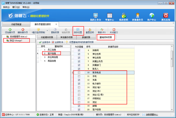 以信管飛RMS標(biāo)準(zhǔn)版為例,介紹一下,進(jìn)銷存管理軟件如何設(shè)置操作員不可查看客戶的聯(lián)系電話及地址相關(guān)信息。