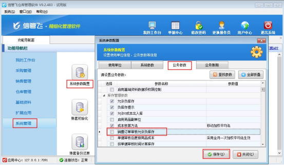在功能導(dǎo)航窗點(diǎn)擊“系統(tǒng)管理”—》“系統(tǒng)參數(shù)配置”選擇“業(yè)務(wù)參數(shù)”,找到參數(shù)“銷售訂單審核允許負(fù)庫(kù)存”取消勾選,然后保存配置,如下圖所示: