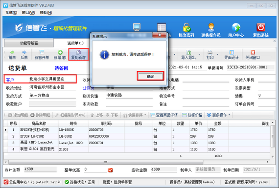 送貨單支持復制新增功能,可以選擇已確認開單的送貨單進行復制新增生成一個一模一樣的新單據。如下圖所示: