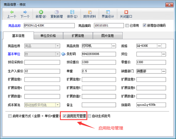 信管飛RMS(進(jìn)銷存管理軟件)專業(yè)版支持批號(hào)管理功能,可以對(duì)商品進(jìn)行分批次出入庫(kù),如下圖所示,在編輯商品信息界面勾選“啟用批號(hào)管理”,即可啟用此商品批號(hào)管理功能。