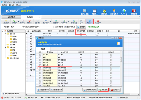 首先,在商品信息界面工具欄中點(diǎn)擊“界面設(shè)計(jì)”打開界面設(shè)計(jì)界面,將“啟用批號(hào)管理”列配置顯示出來,如下圖所示。