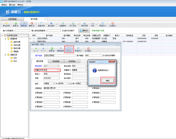 選擇員工后,修改客戶信息界面所屬業務員已修改為“張亞”,點擊保存,即彈出提示框“數據保存成功!”,保存鍵變為灰色。如下圖所示: