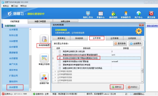手動標記完成的訂單如需不再自動更新執(zhí)行狀態(tài),軟件可設置參數(shù)控制,在功能導航窗點擊“系統(tǒng)管理”—》“系統(tǒng)參數(shù)配置”,在“業(yè)務參數(shù)”中的“業(yè)務單據(jù)相關參數(shù)”勾選啟用參數(shù)“手動標記完成的訂單不再自動更新執(zhí)行狀態(tài)”,然后保存設置,如下圖所示: