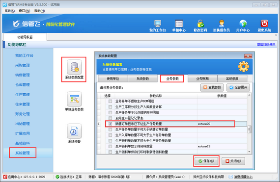 在功能導航窗點擊“系統管理”—》“系統參數配置”—》“業務參數”打開業務參數配置界面,然后在生產管理相關參數中打鉤啟用“銷售訂單顯示已下達生產任務數量”參數,并設置參數值,默認為“extnum20(擴展數值20)”,如下圖所示。