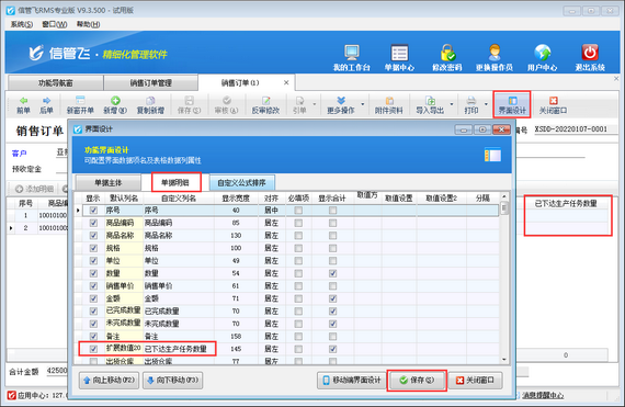 參數配置完成之后,打開銷售訂單,在“界面設計”—》“單據明細”中將“擴展數值20”自定義列名為“已下達生產任務數量”,并勾選顯示出來,如下圖所示。