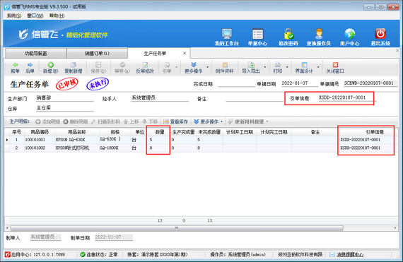 然后設置完成后,新開生產任務單引用銷售訂單的情況下,即可看到銷售訂單界面“已下達生產任務數量”可自動更新,如下圖所示。