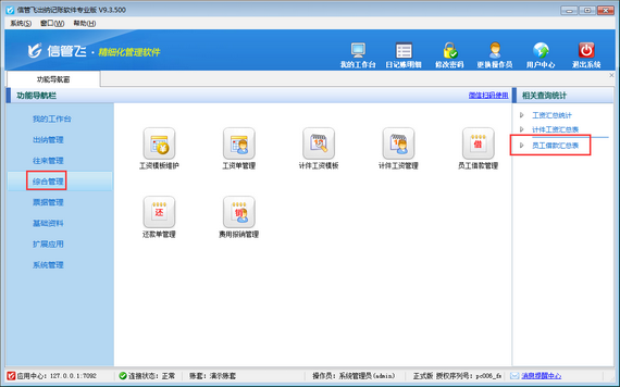 操作員權(quán)限設(shè)置完成后,使用操作員“張亞”登錄軟件,打開綜合管理模塊,查看相關(guān)查詢統(tǒng)計報表,可以看到操作員賬號已無法查看到“員工借款匯總表”。