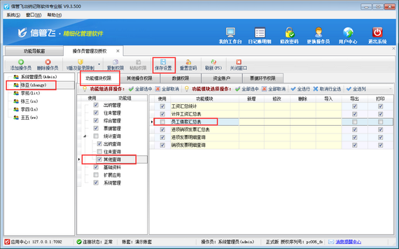 登錄軟件,在功能導航窗點擊“系統(tǒng)管理”—》“操作員及授權(quán)”,進入“操作員管理及授權(quán)”界面,選擇操作員“張亞”,在其右側(cè)的功能模塊權(quán)限內(nèi)選擇“其他查詢”模塊,將員工借款匯總表的“使用”權(quán)限勾選取消,然后保存設(shè)置,如下圖所示。