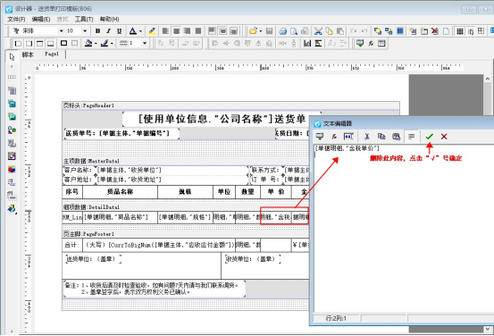 在送貨單開單界面,點擊打印按鈕下的“打印格式設計”,選擇此模板,點擊“設計格式”進入模板設計器界面。在模板設計器中,把單價和金額對應的明細數據項文本框雙擊打開,把里面調用的數據項刪除,然后保存模板,如下圖所示: