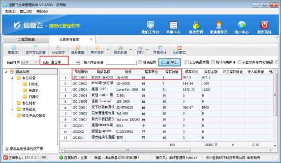 本文以“信管飛倉(cāng)庫(kù)管理軟件”為例,示范下如何開(kāi)“盤(pán)點(diǎn)單”,在功能導(dǎo)航窗點(diǎn)擊“倉(cāng)庫(kù)管理”—>“倉(cāng)庫(kù)庫(kù)存查詢”,可查看商品的當(dāng)前庫(kù)存數(shù)量,以示例商品“EPSON LQ-630K”的庫(kù)存數(shù)量為例,當(dāng)前查詢到庫(kù)存數(shù)數(shù)量為1。存在多倉(cāng)庫(kù)情況的,需要先選擇倉(cāng)庫(kù)然后再進(jìn)行查詢,是獲取查詢的倉(cāng)庫(kù)中的庫(kù)存數(shù)量,如下圖所示:
