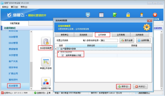 功能導航窗點擊“系統管理”—》“系統參數配置”,“業務參數”中特殊功能參數中勾選“啟用單據確認功能”參數,保存配置,如下圖:
