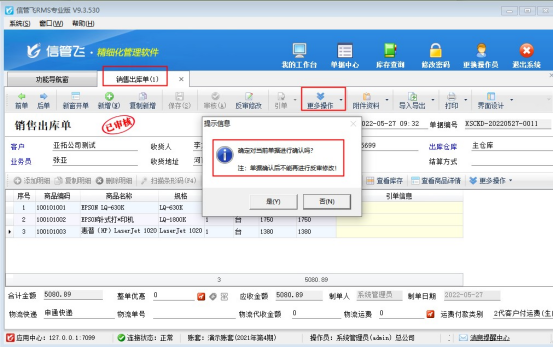 參數啟用完成后,銷售管理中新開一個銷售出庫單保存并審核,審核完成后在更多操作下點擊“確認單據”,確認單據時會提醒“單據確認后不能再進行反審修改!”,點擊“是”確認單據完成,如下圖: