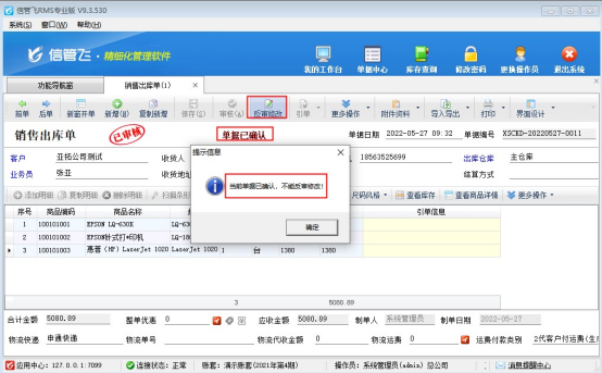 信管飛RMS軟件支持設置操作員設置反審修改權限,操作員有反審修改權限就可以對已審核單據進行反審操作,有客戶需要已審核的單據不能再進行修改,針對這一情況,最新版本添加了單據確認功能,本文示范下單據確認功能如果使用?