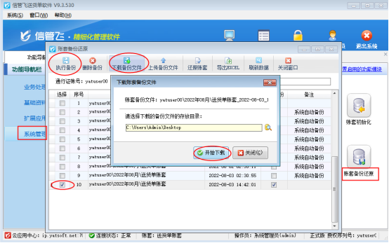 云賬套版本數據默認存儲在云服務器上,需要換到本地版使用,在云賬號即將到期時打開“系統管理”—》“賬套備份還原”,在賬套備份還原界面點擊“執行備份”,執行備份完成,選擇下備份文件,點擊“下載備份文件”到選擇的存放目錄中,隨后點擊“開始下載”,完成后則云賬套數據備份下載到本地存放目錄中,如下圖所示: