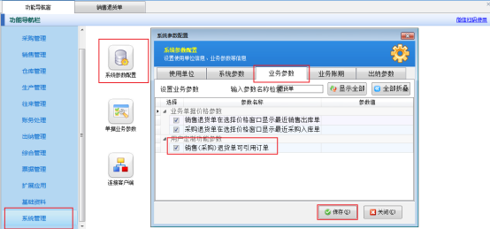 在功能導航窗點擊“系統管理”—》“系統參數配置”,進入系統參數配置界面,點擊“業務參數”,勾選“銷售(采購)退貨單可引用訂單”參數,點擊保存按鈕,如下圖所示: