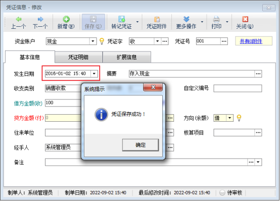 反結賬操作完成,返回新增日記賬界面重新保存補錄1月份的單據,可以正常保存審核。如下圖所示: