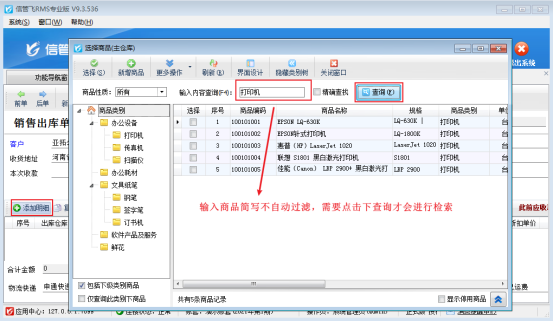 信管飛RMS軟件開單前可提前維護好商品信息到基礎資料中,新開單據選擇客戶后,點擊“添加明細”可彈出選擇商品界面,可選擇添加好的商品信息,有用戶反映在選擇商品界面,查詢窗口輸入商品簡寫不自動過濾,需要點擊下查詢才會進行檢索,如下圖所示: