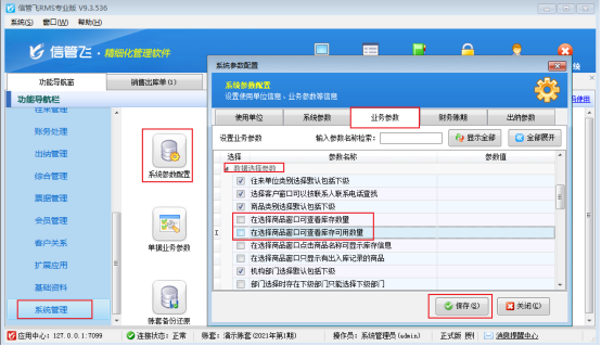如何設置輸入商品時自動檢索,操作步驟如下,在功能導航窗點擊“系統管理”—“系統參數配置”,在“業務參數”的選擇參數中取消勾選參數“在選擇窗口可查看庫存數量”和“在選擇窗口可查看庫存可用數量”,然后保存設置,如下圖所示: