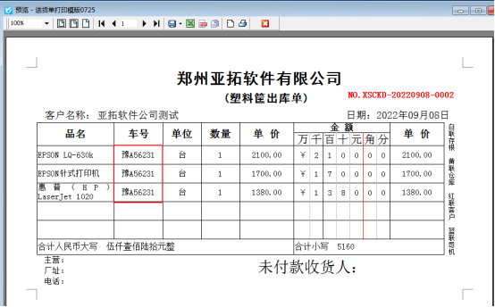 新增一個送貨單,保存單據后預覽默認模板顯示送貨車號,如下圖所示: