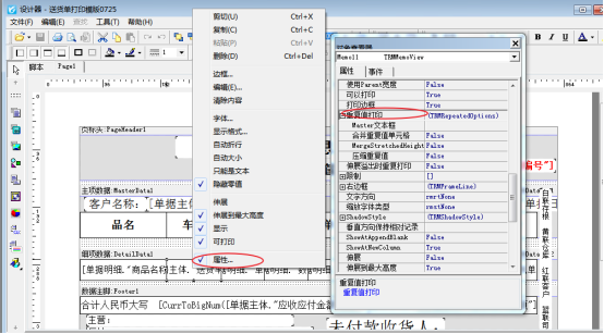 在送貨單開單界面,點擊打印按鈕下的“打印格式設計”,選擇此模板,點擊“設計格式”進入模板設計器界面。在模板設計器中,把送貨車號對應的明細數據項文本框右鍵屬性打開,把重復值打印下“合并重復單元格和壓縮重復值”改為“TRUE”,然后保存模板,如下圖所示: