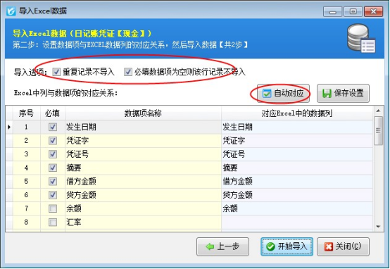 如果有多個資金賬戶,需要按資金賬戶進(jìn)行導(dǎo)入,選擇資金賬戶后選擇Excel文件,下一步進(jìn)行數(shù)據(jù)項(xiàng)對應(yīng),可以點(diǎn)擊“自動對應(yīng)”按鈕,可自動對應(yīng)Excel表頭內(nèi)容和軟件中數(shù)據(jù)項(xiàng),對應(yīng)完成點(diǎn)擊“開始導(dǎo)入”,導(dǎo)入完成有導(dǎo)入結(jié)果。如下圖所示:
