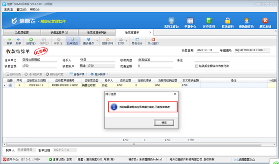 如修改收款結算單時提示:“當前結算單是由業務單據生成的,不能反審修改”該如何操作?如下圖所示,本篇文章示范下操作步驟。