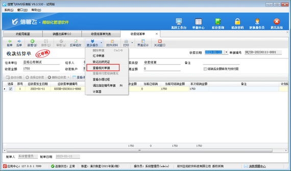 打開收款結算單界面,在工具欄更多操作下點擊“查看相關單據”,系統會直接打開相應的銷售出庫單。可對銷售出庫單進行反審修改操作,在銷售出庫單界面反審修改后,收款結算單即可同步修改。如下圖所示,修改銷售出庫單“本次收款賬戶”后,收款結算單可同步進行修改。