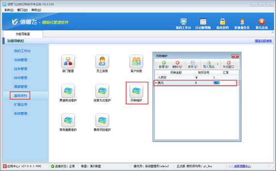 首先進(jìn)行幣種設(shè)置,在軟件功能導(dǎo)航窗點(diǎn)擊“基礎(chǔ)資料”—》“幣種維護(hù)”打開幣種維護(hù)窗口,可設(shè)置幣種名稱、貨幣符號以及匯率信息,如圖所示,設(shè)置幣種“美元”、匯率為6.74,1美元 = 6.74人民幣。