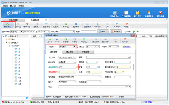如登記日記賬時選擇的是外幣賬戶,新增憑證信息窗口可自動顯示“匯率”及“(本位幣)金額”信息,錄入原幣金額后,系統(tǒng)可自動計(jì)算本位幣金額。