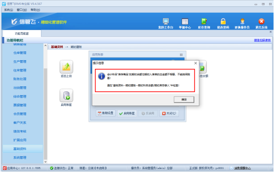信管飛RMS專業版支持財務處理模塊,存在會計科目。新用戶使用軟件時,在賬套啟用前錄入了期初入庫單,錄入庫存數量和成本,保存后在賬套啟用界面點擊啟用賬套,會提示如圖以下消息,啟用不了賬套。